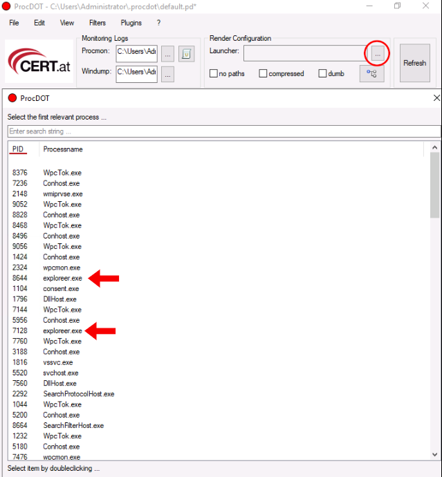 The first question can be found after uploading the Logfile.CSV and traffic.pcap files from the Analysis Files to ProcDot and selecting the Launcher button to select a process from the list. After doing so a list of processes that were active while procmon was monitoring while be shown. After looking through the list I was able tell these two PIDs (8644,7128) were spawned from the malicious executable exploreer.exe. It's safe to assume it was given this name so that it could be easily overlooked and would be confused for the actual explorer.exe.